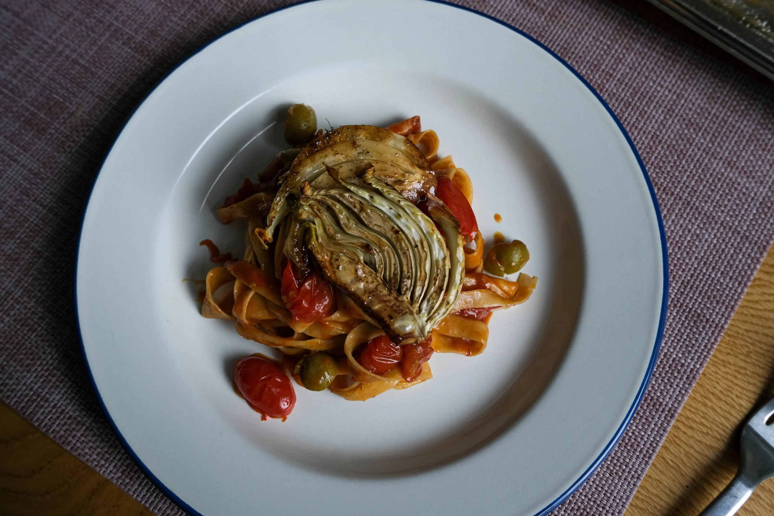 Serveer de geroosterde venkel op een mooi plat bord en geniet van dit heerlijke, aromatische bijgerecht.