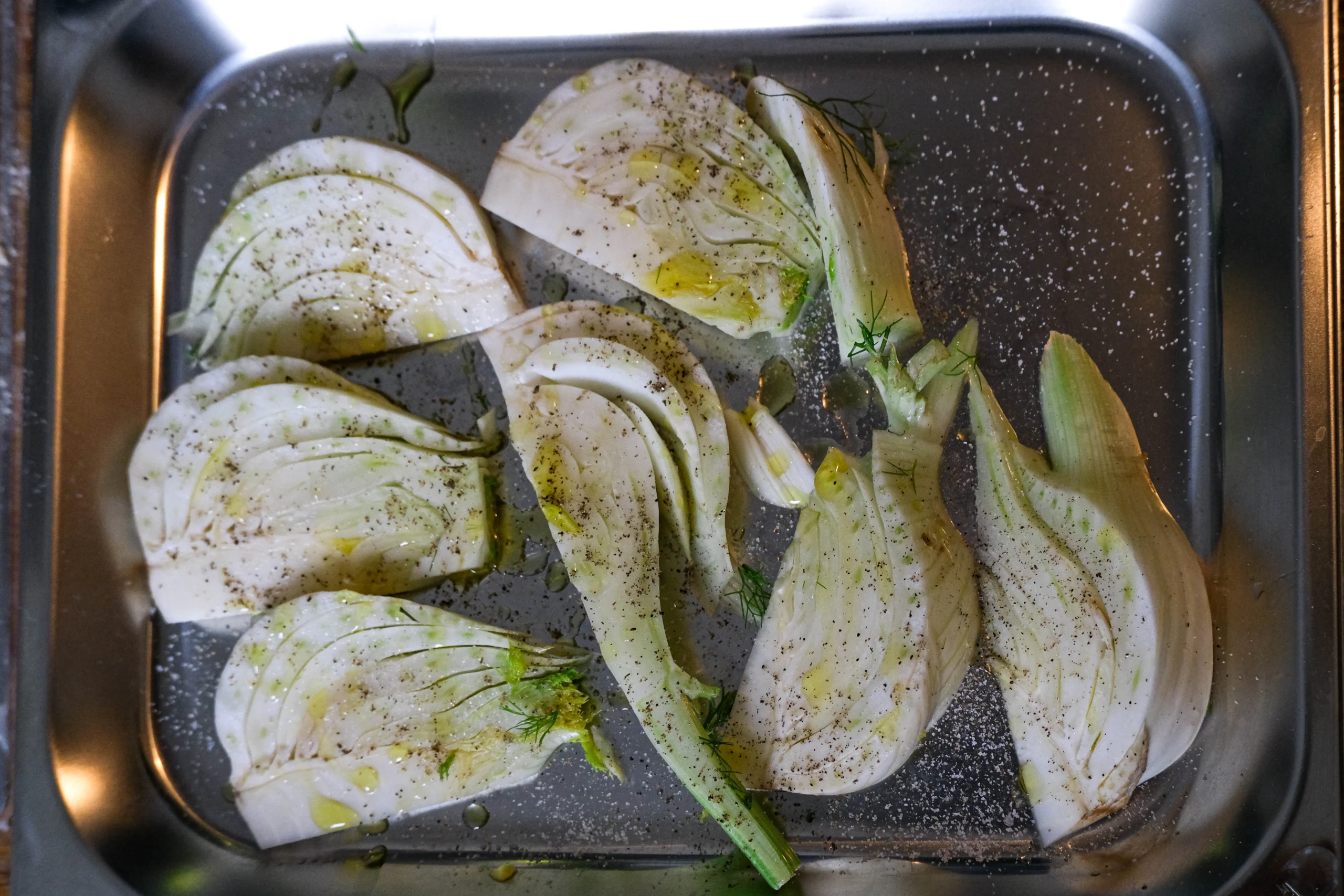 Giet ongeveer twee eetlepels olijfolie over de venkel en bestrooi met peper en zout naar smaak.